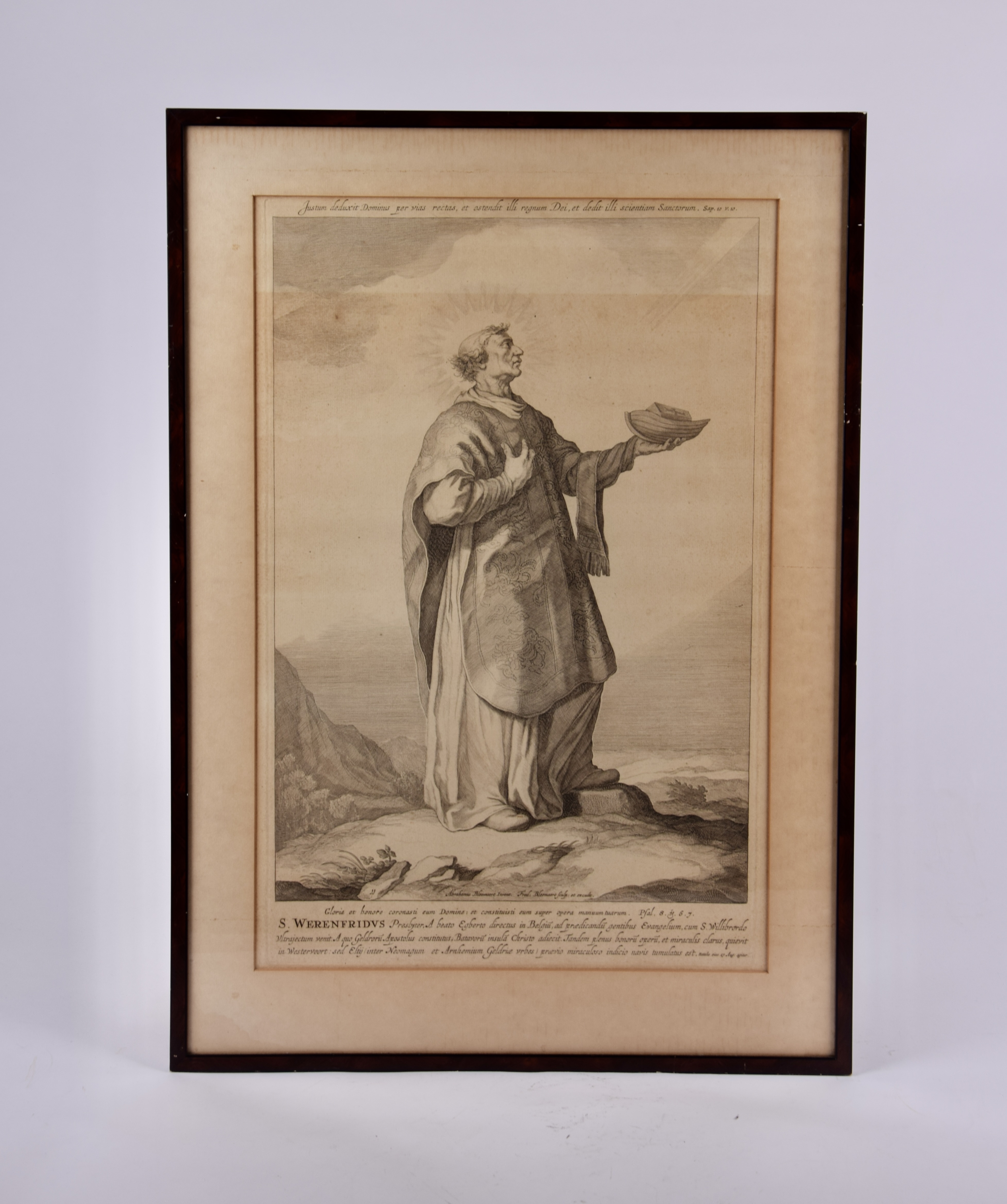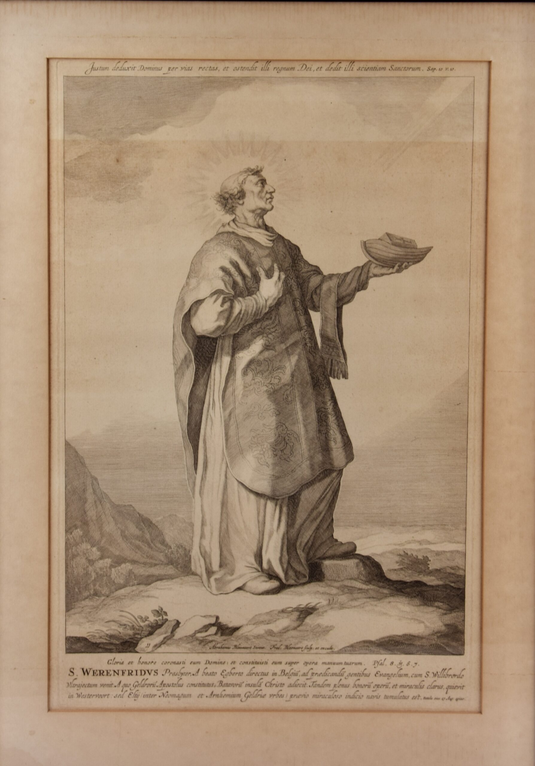 De heilige Werenfridus is afgebeeld als een priester met tuniek, kazuifel en armdoek. Hij draagt een schip met zijn doodskist, zijn attribuut, in zijn handen. Na zijn dood waren er twisten over de plaats van zijn graf. De doodskist werd in een boot geplaatst en dat boot dreef tegen de stroom in naar Elst, waar Werenfridus pastoor was geweest. Met een Latijns onderschrift. Prent uit een serie van twaalf prenten met prelaten en bisschoppen van Utrecht door Cornelis en Frederick Bloemaert.