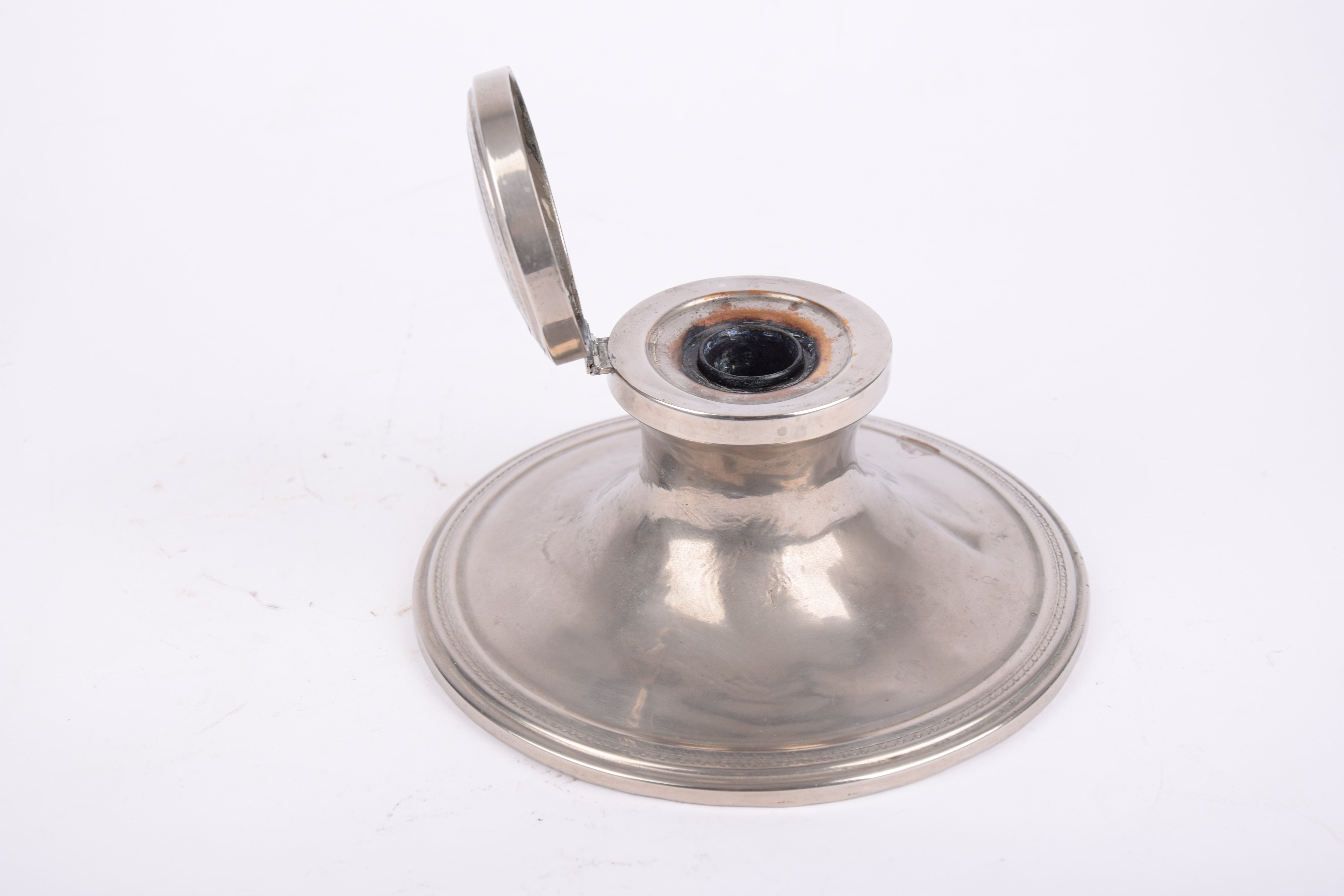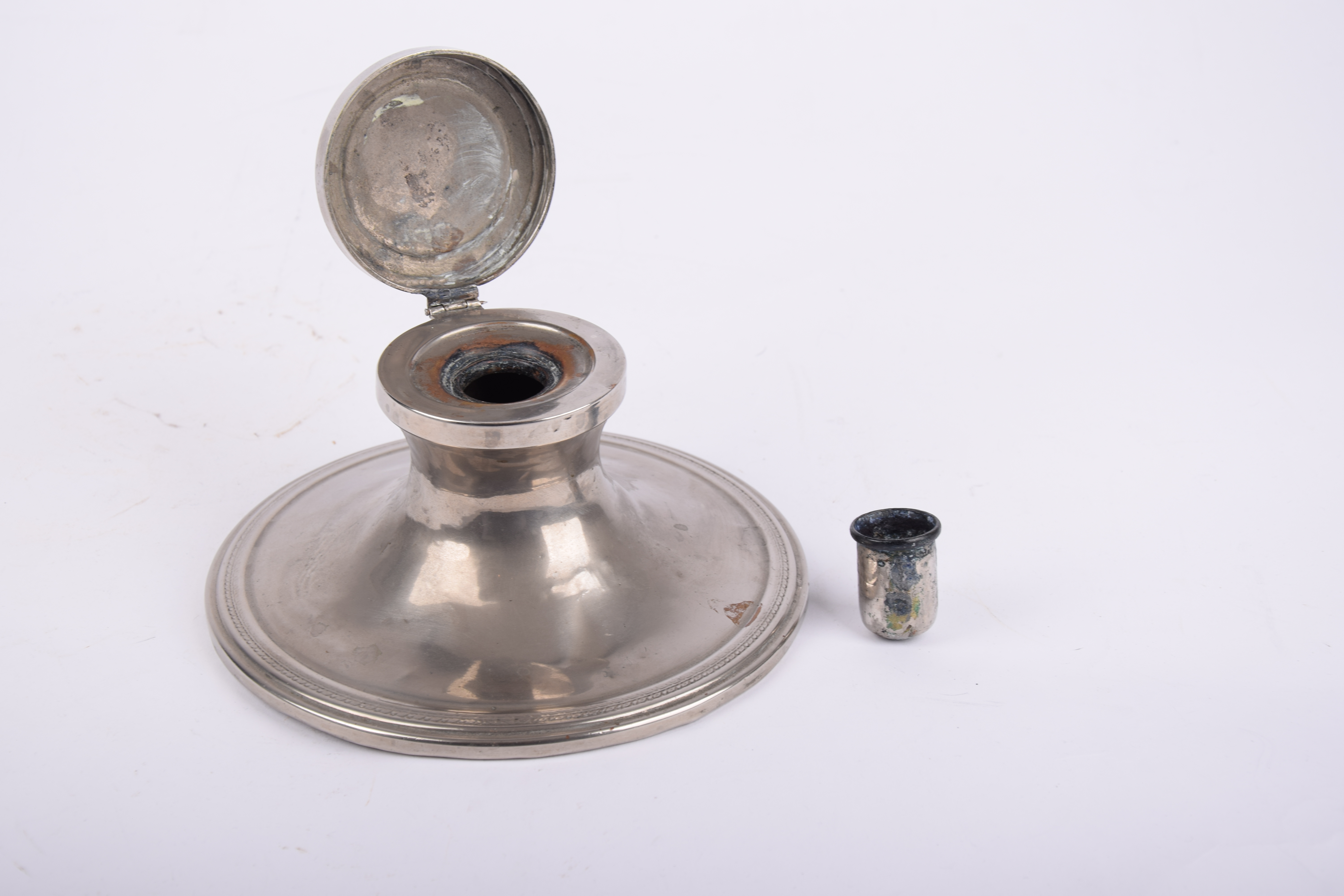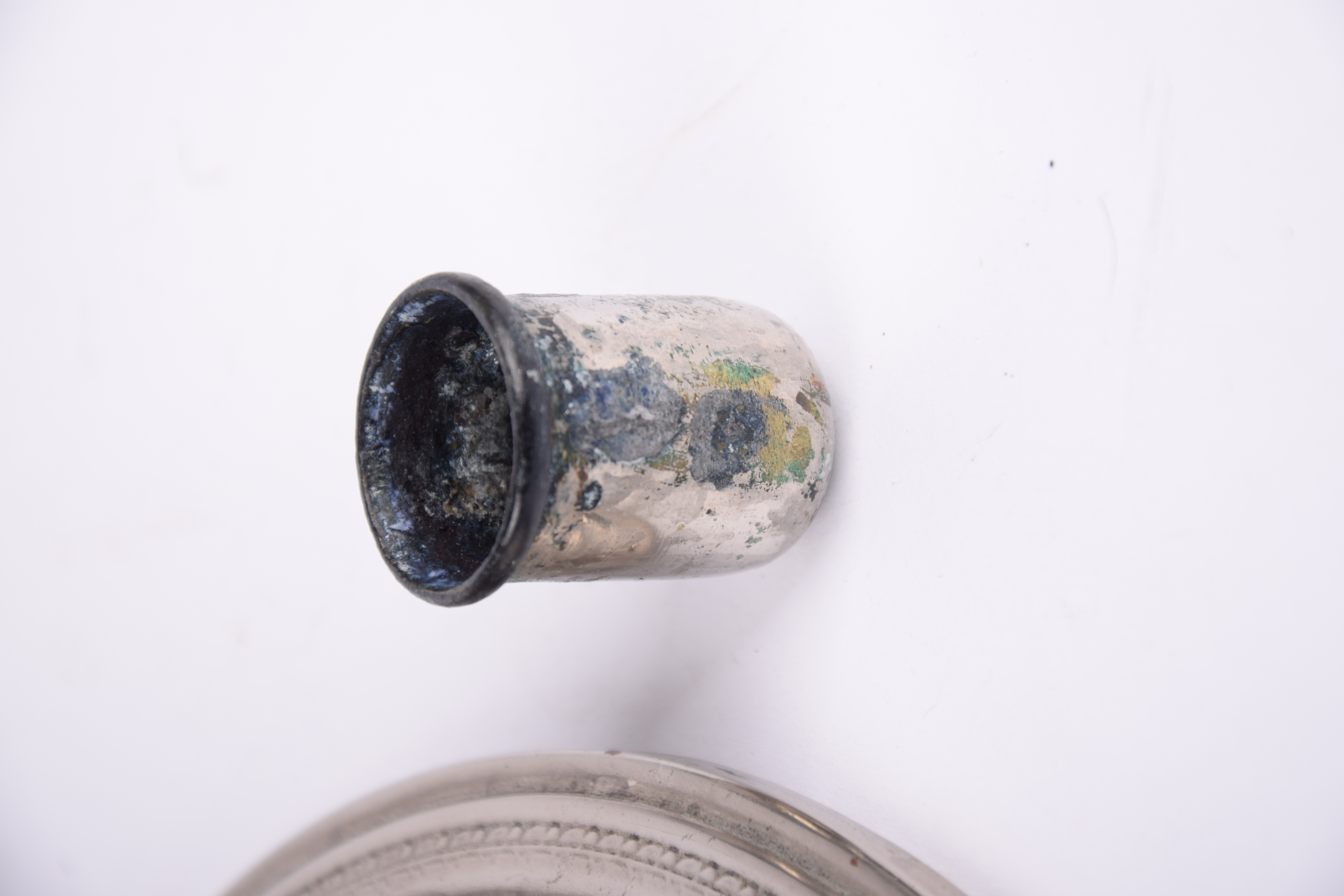 Origineel metalen inktpot aanwezig, natuurlijk met inktresten.
