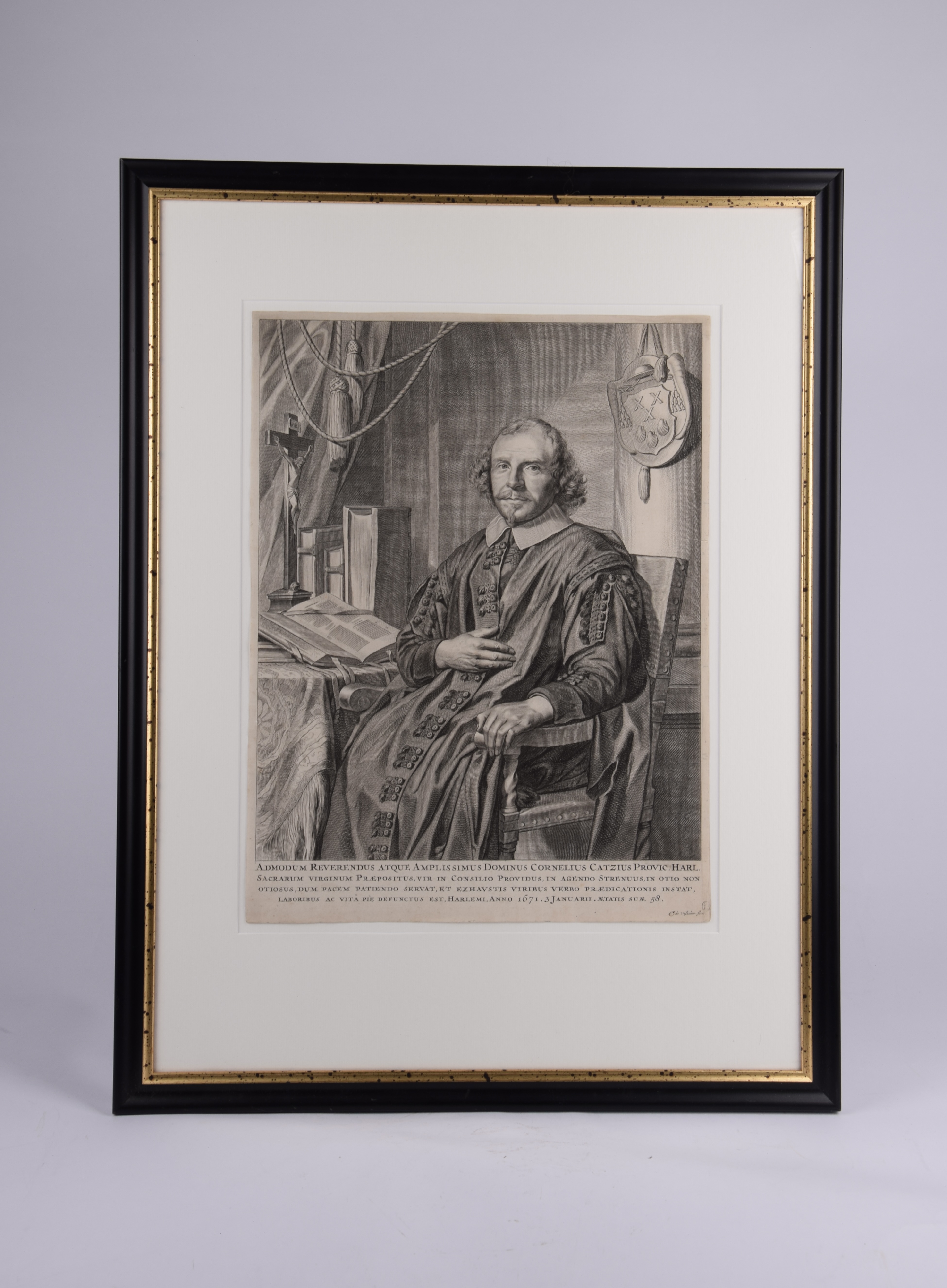 De geestelijke Cornelis Cats, zittend in een stoel aan een tafel met boeken en een crucifix.