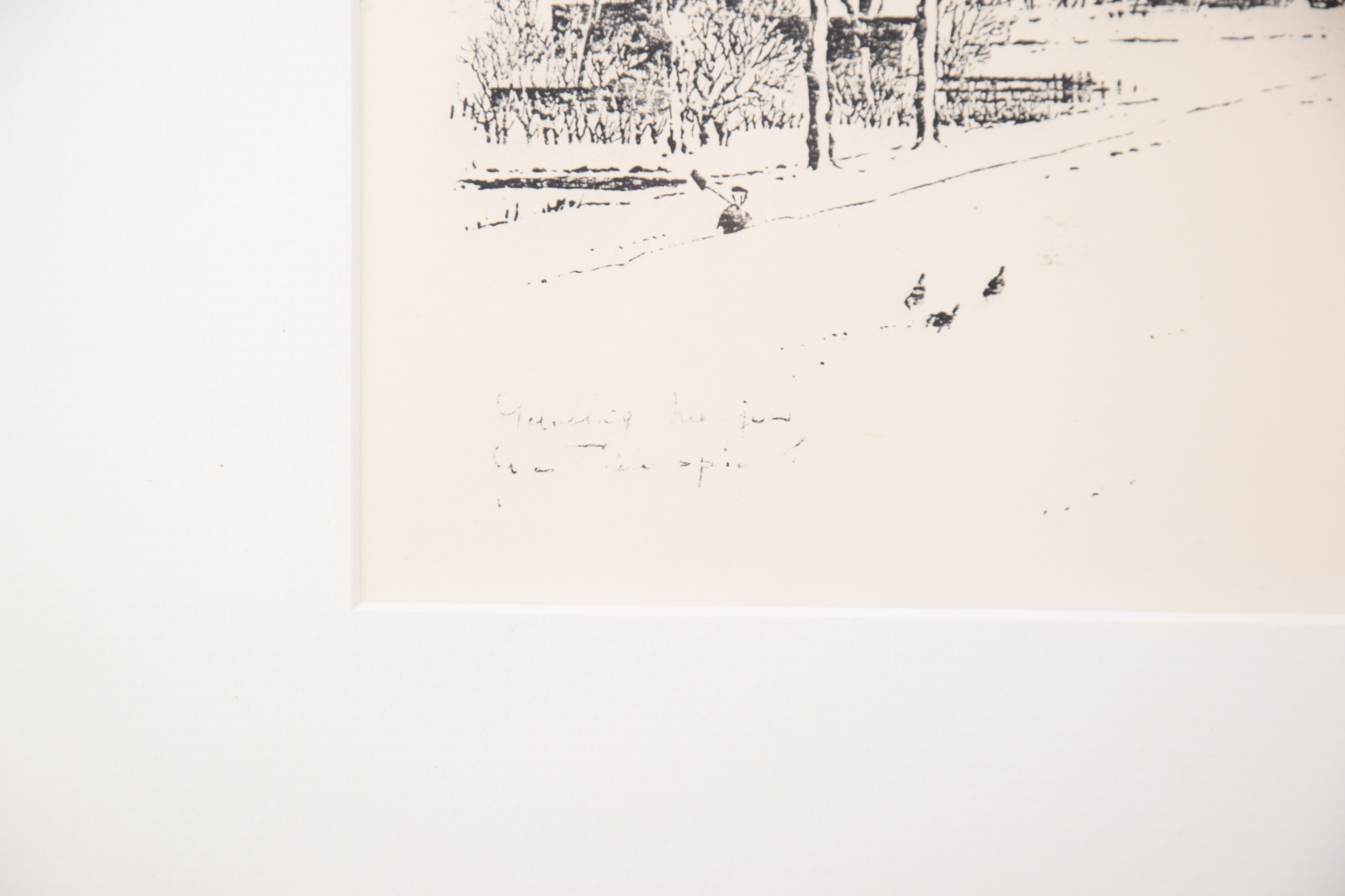 Boerderijen met in m midden twee kinderen die een sneeuwpop aan het maken zijn. Links nog een boer en wat kippen te zien.
