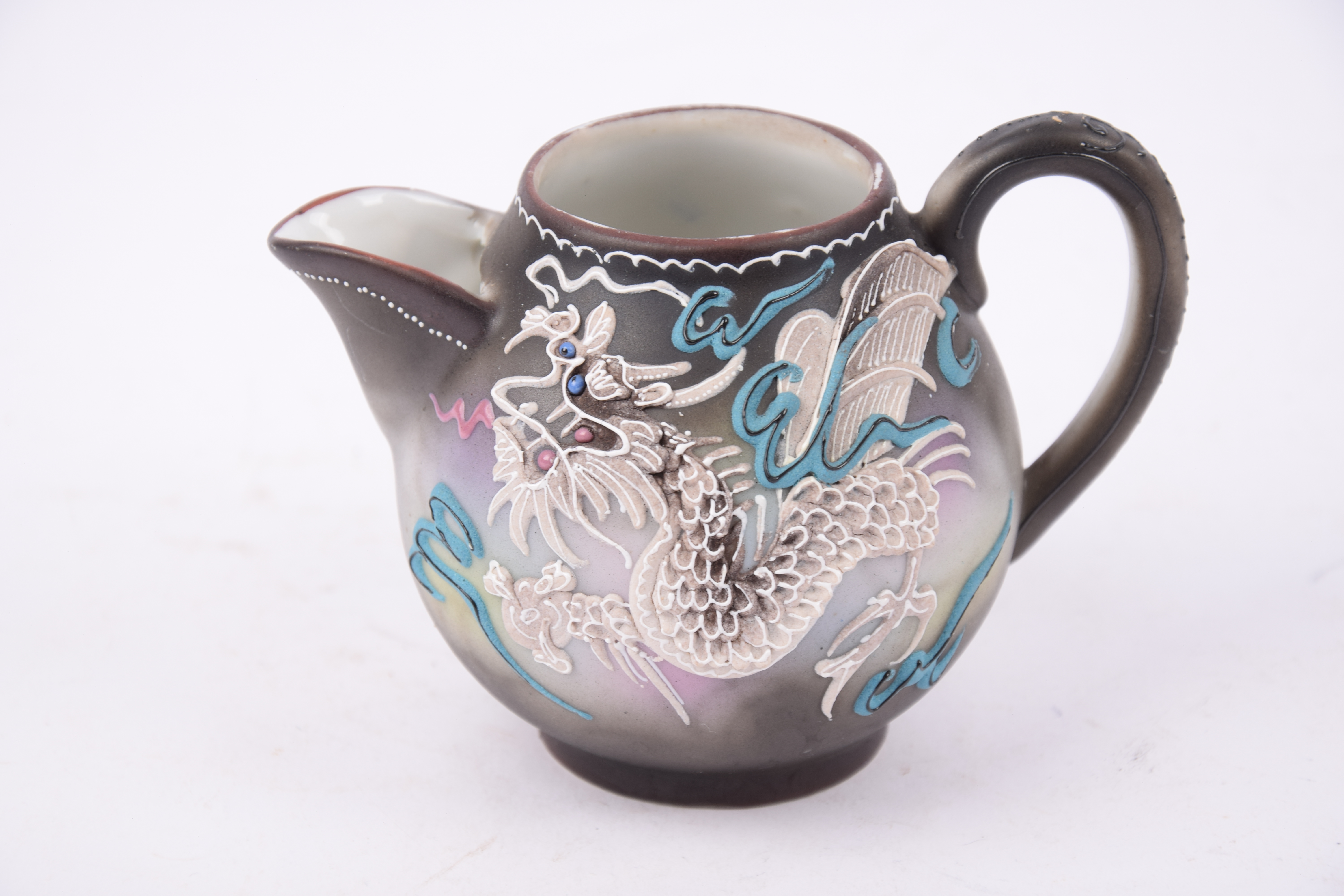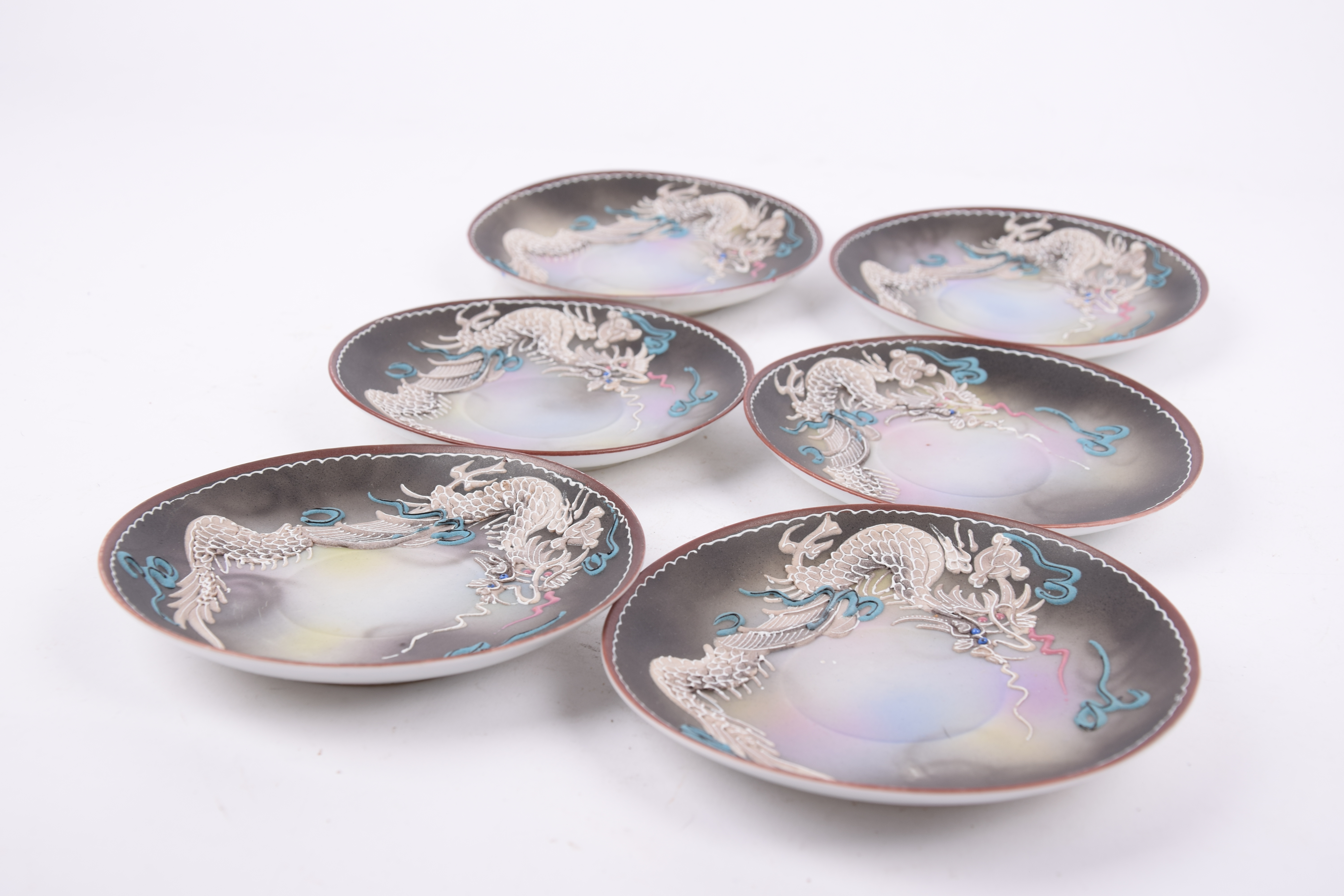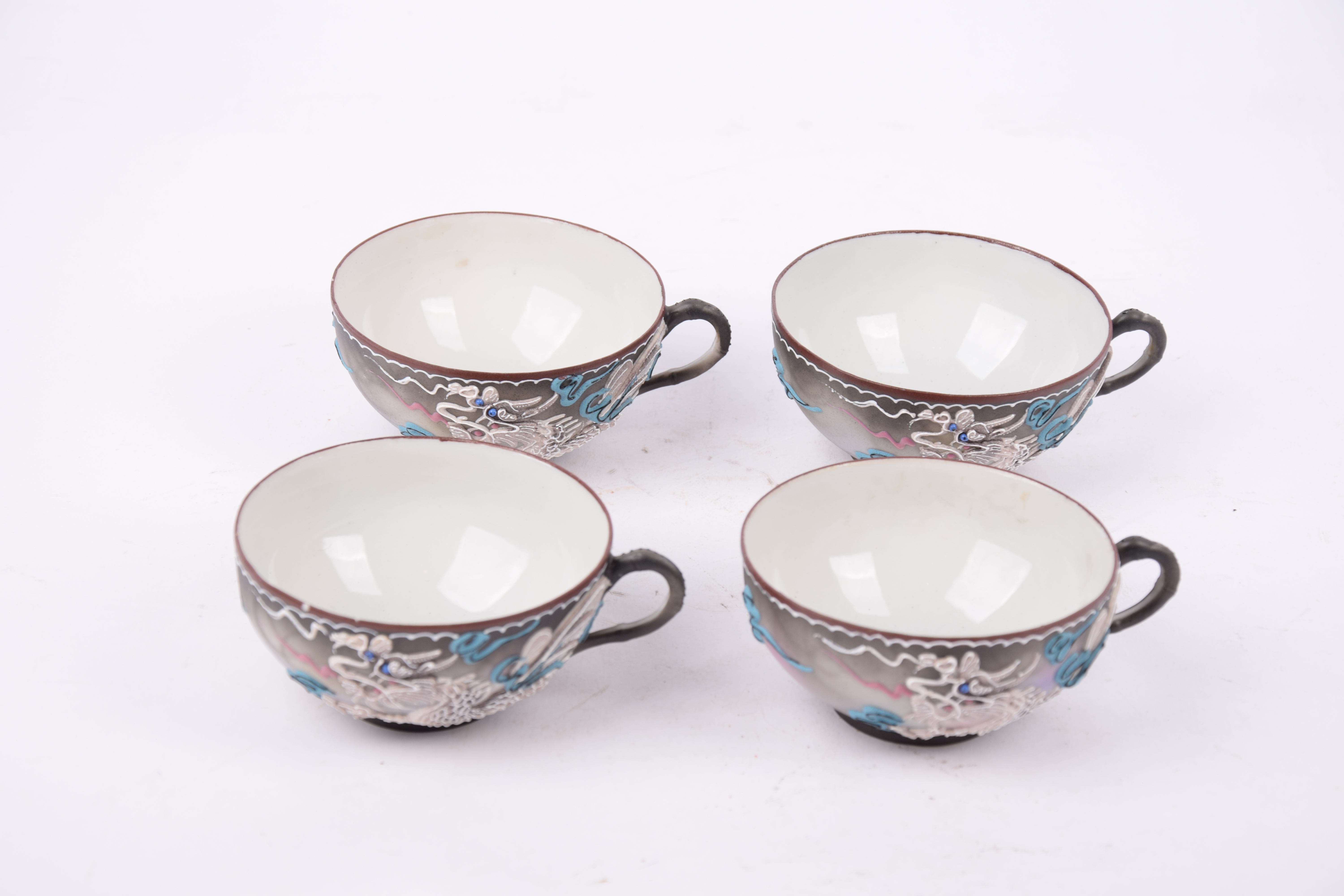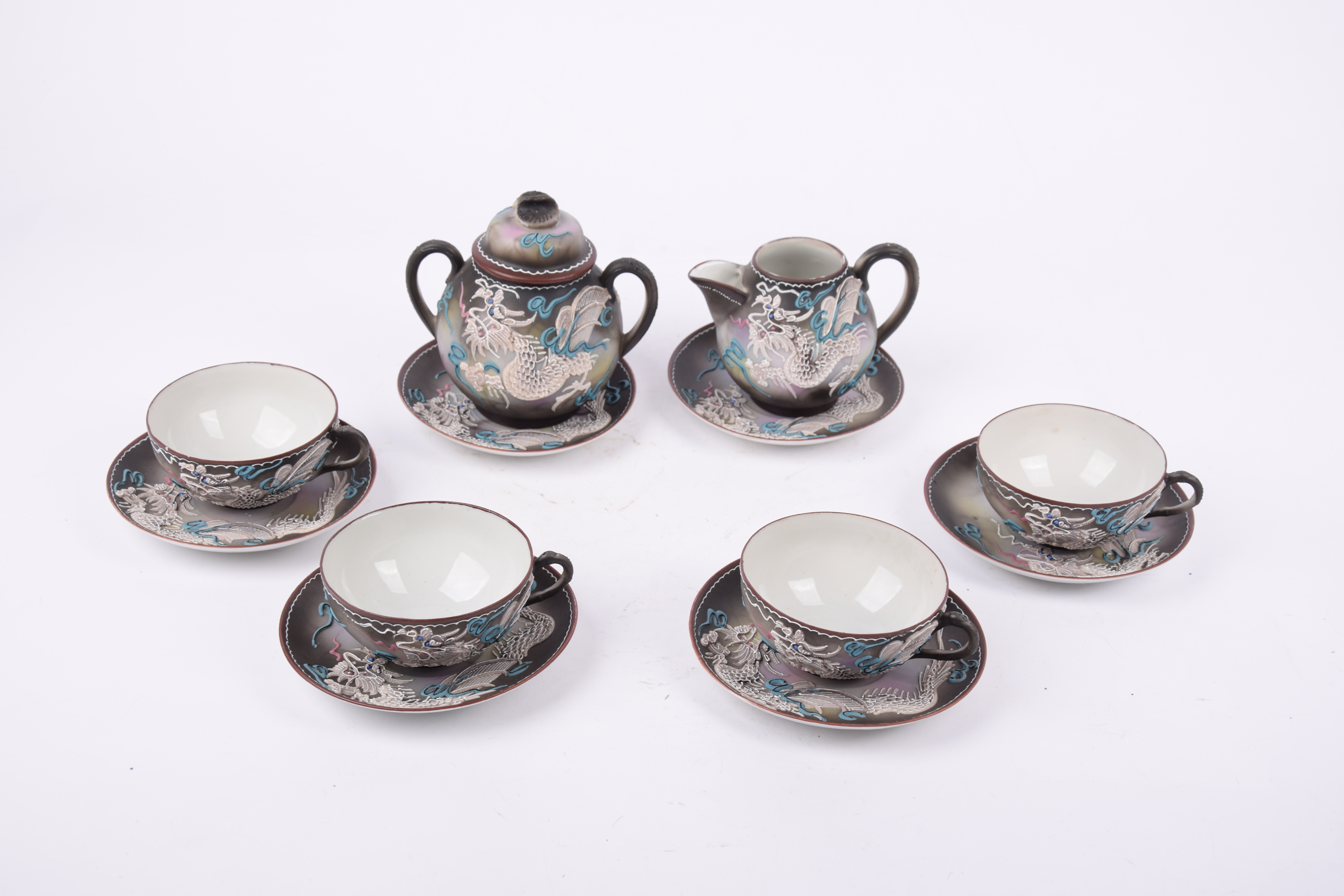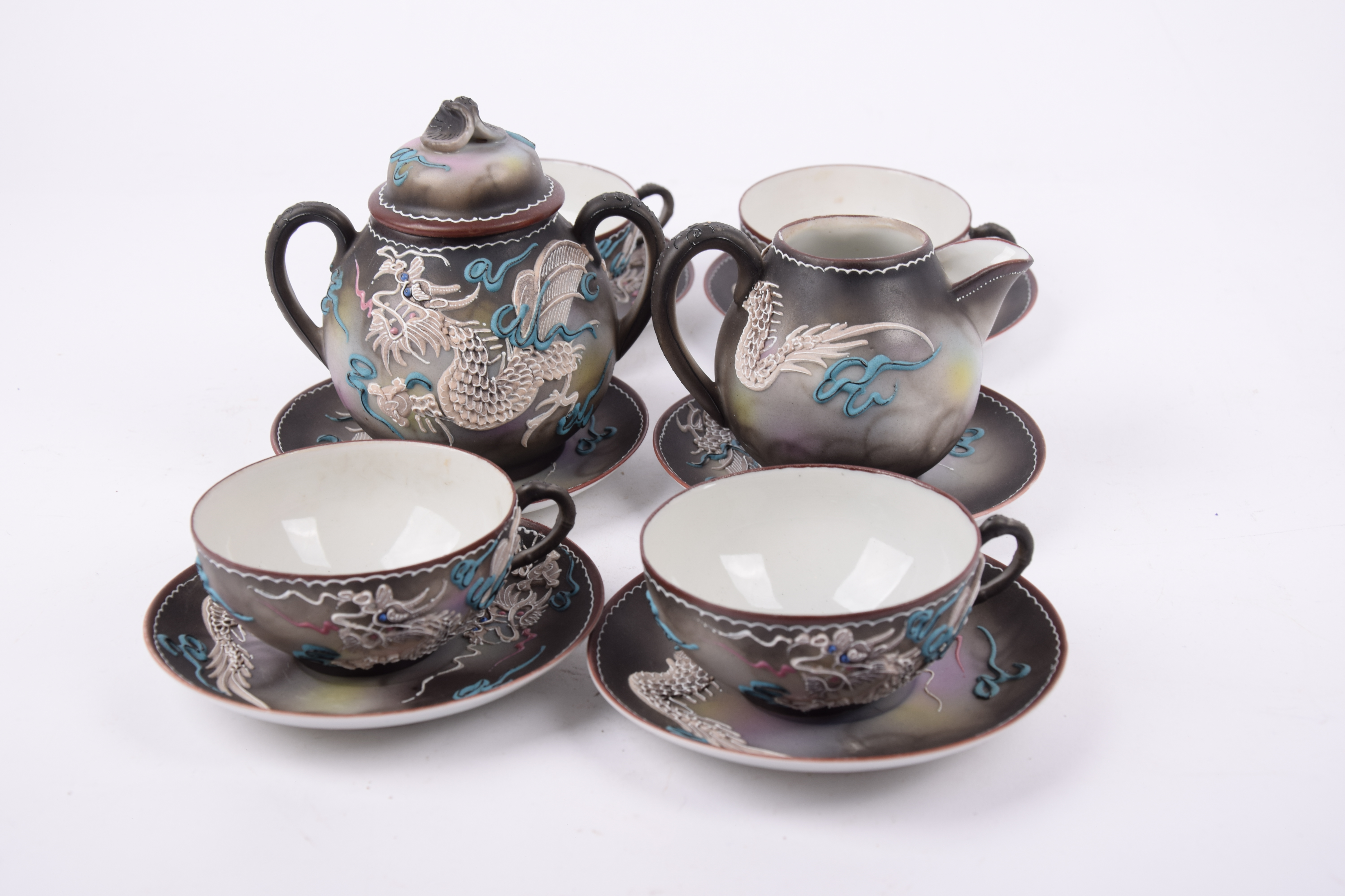 Het servies is gemaakt van porselein en voorzien van een driedimensionaal ‘moriage’ decoratief drakenmotief.