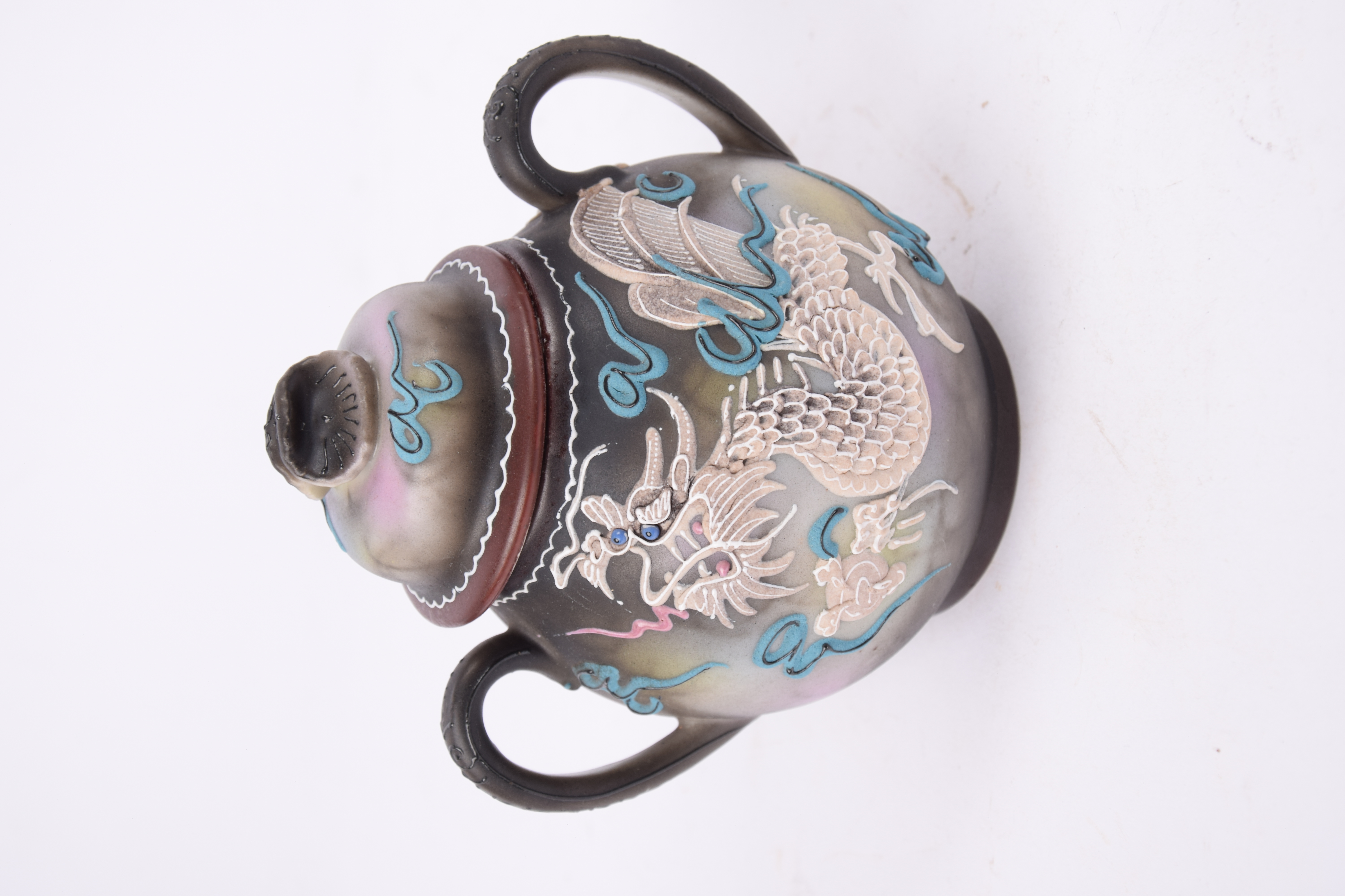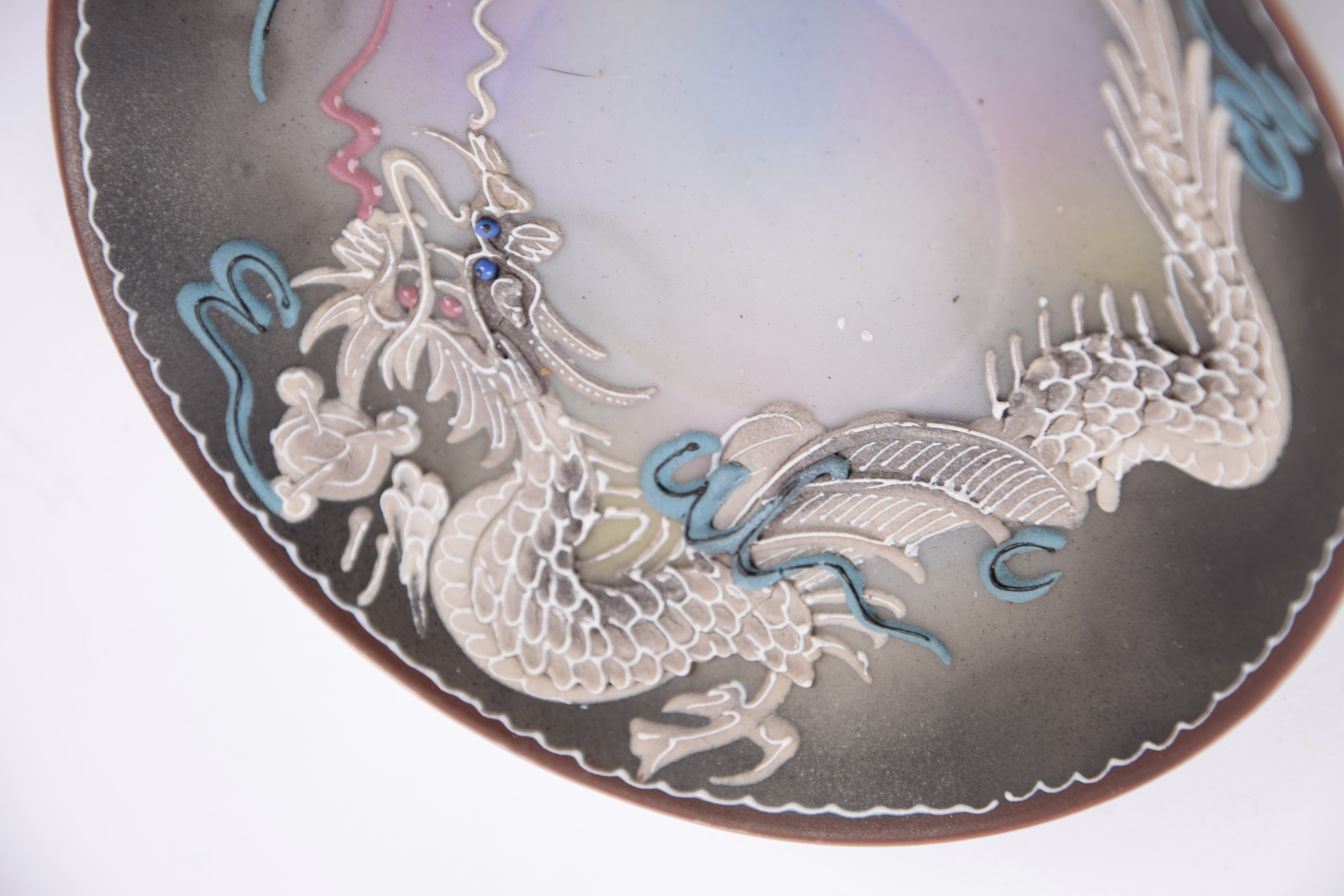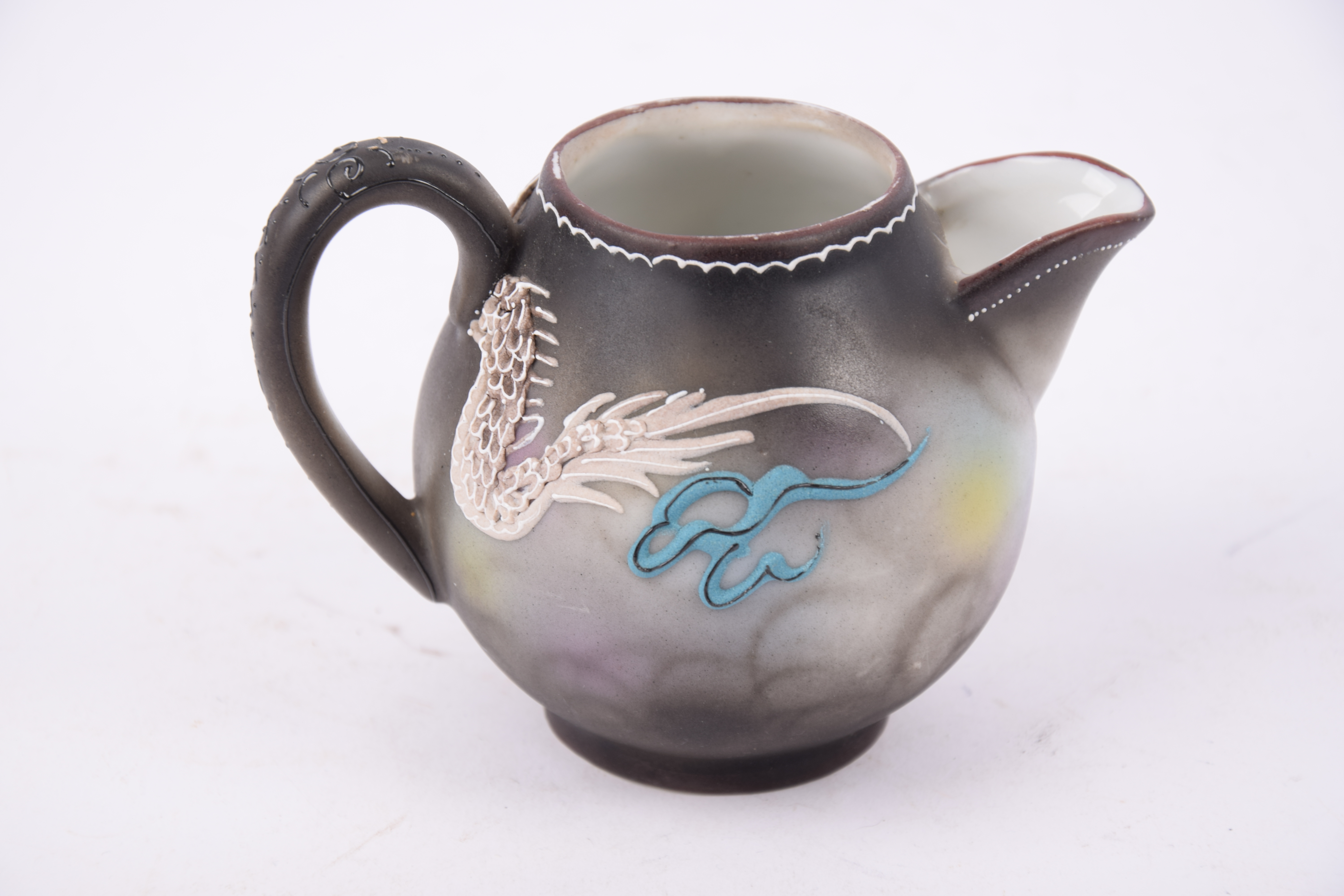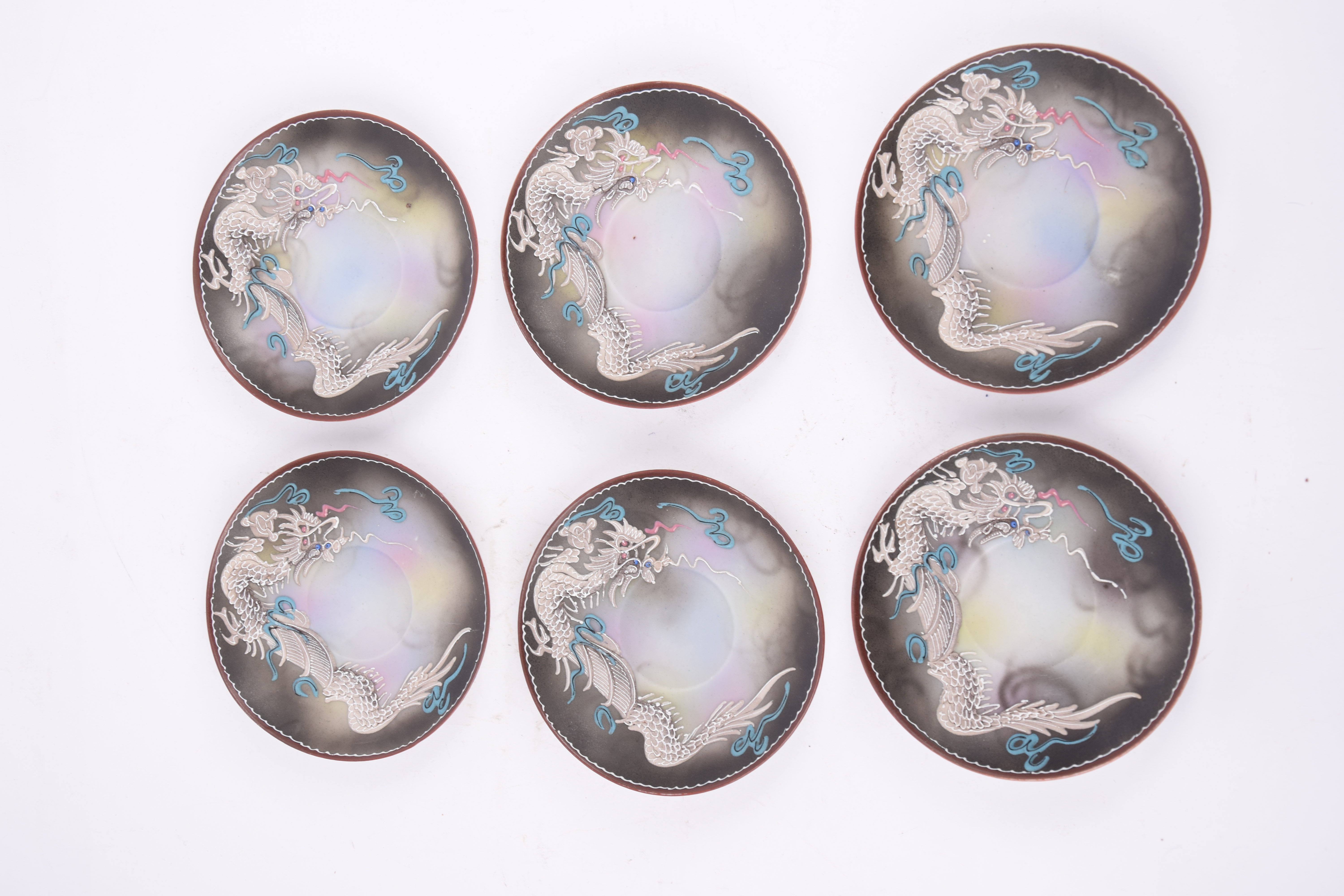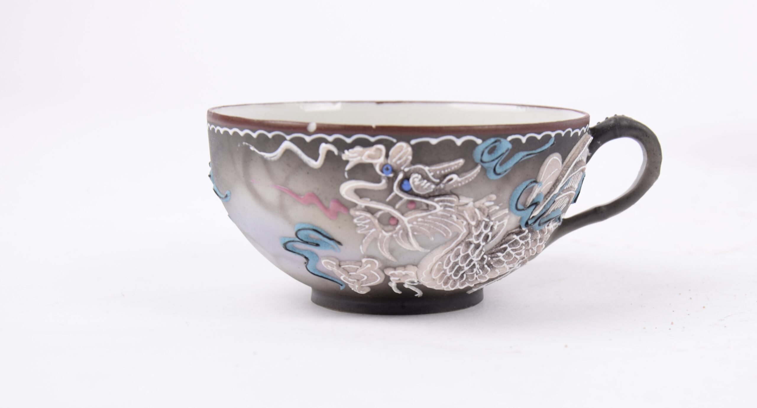 Het servies is gemaakt van porselein en voorzien van een driedimensionaal ‘moriage’ decoratief drakenmotief.
